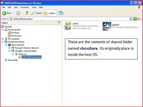 In my opinion, virtual machine or virtual computer is separated from the host machine (the real computer that we can touch). It means, although virtual machine is installed inside the host computer, but the link or connection between them seem not exist. Now, let say you want to copy data reside in the host OS (Windows 7) into guest OS (Windows XP). What you need to do is you must retrieve the share folder you had created inside the host OS from the guest OS. You can do it using the following steps: